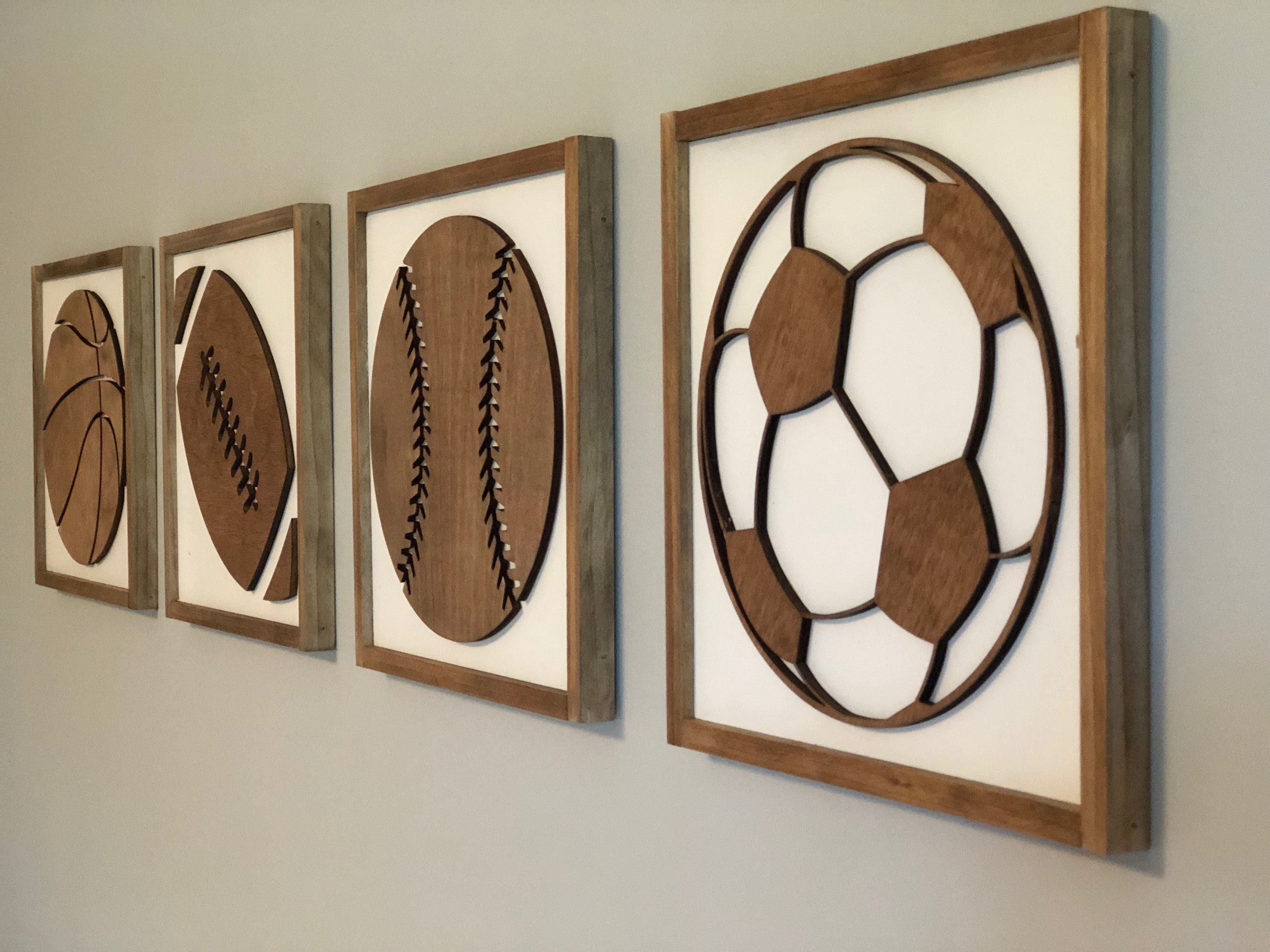 The stupell home decor collection number 1 fan with ball and glove canvas wall art. Free shipping on orders over $39. 1 out of 5 stars with 1 ratings. Djsylife inspirational sports wall art 5 piece football poster ornament painting on canvas prints home decor for sports room bedroom living room decorations ready to hang. The beige walls work well with the brown area rug that sits on dark wood flooring. Its colorful body is the perfect complement for bold and solid colored bar walls. This is a fun man cave dedicated to the owner. We offer sports wall decor items such as team clocks, team and dynasty banners, and logo flags. Little boy sports room theme, sports kids wall art print, vintage sports decor, set of 4 sports balls, football baseball basketball children. Wall decal world offers removable wall decals for almost every sport! Some sports themed wall decals even allow you to add a name! Root for the home team all year round with a stadium's worth of sports art and photography available. Sports wall decor for boys room: